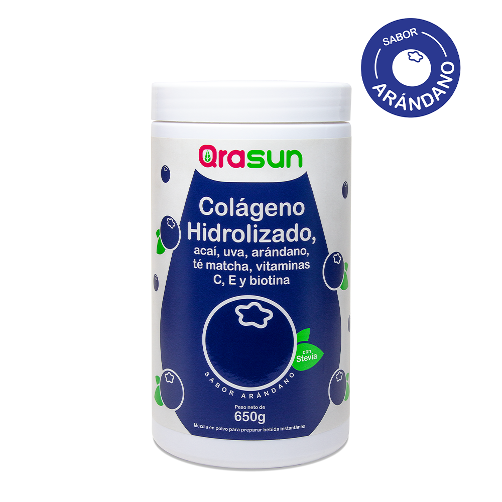 Colágeno hidrolizado + vitamina C, E y biotina (sabor arándano) Pote X 650 G (Polvo) QRASUN