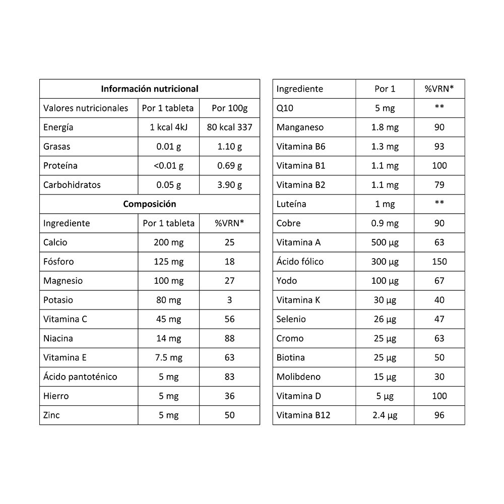 Es un complemento multivitamínico que cuenta con 27 vitaminas, minerales, oligoelementos, luteína y Q10. Ayuda a reforzar el sistema inmune, aumenta los niveles de energía, alivia el estrés y mantiene las uñas, cabello y piel más saludables. Aporta energía y ayuda a reducir la fatiga diaria.